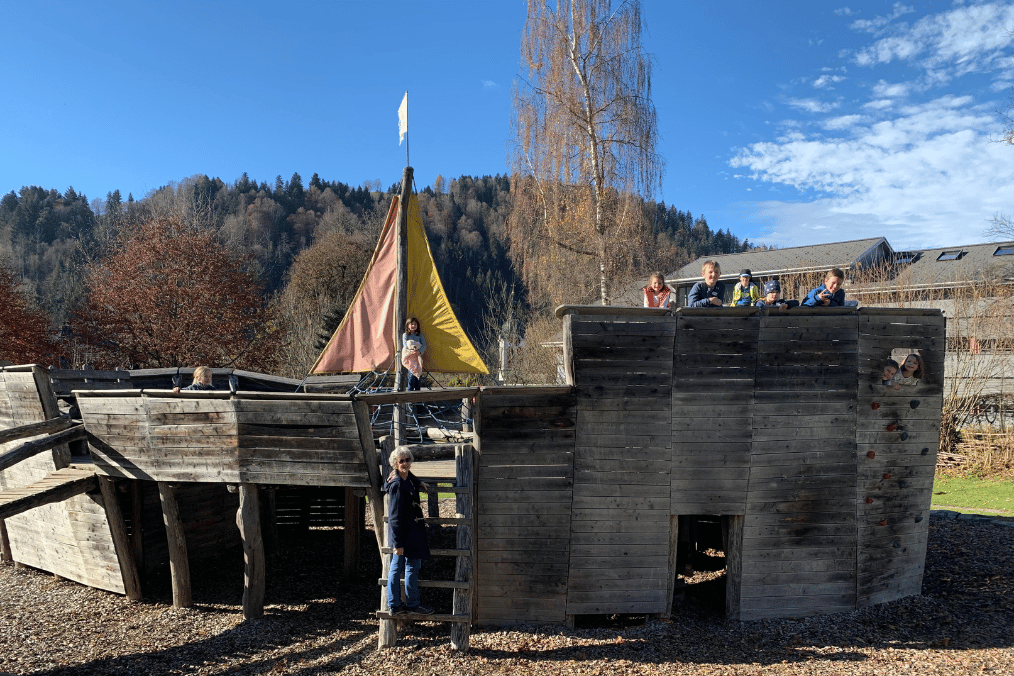 Mit einem echten Holzboot, das der Spielplatz einfach so bietet, sind wir in "See gestochen" und durften uns in die Jünger und Jüngerinnen hineinversetzen, die damals mit Jeus unterwegs waren.